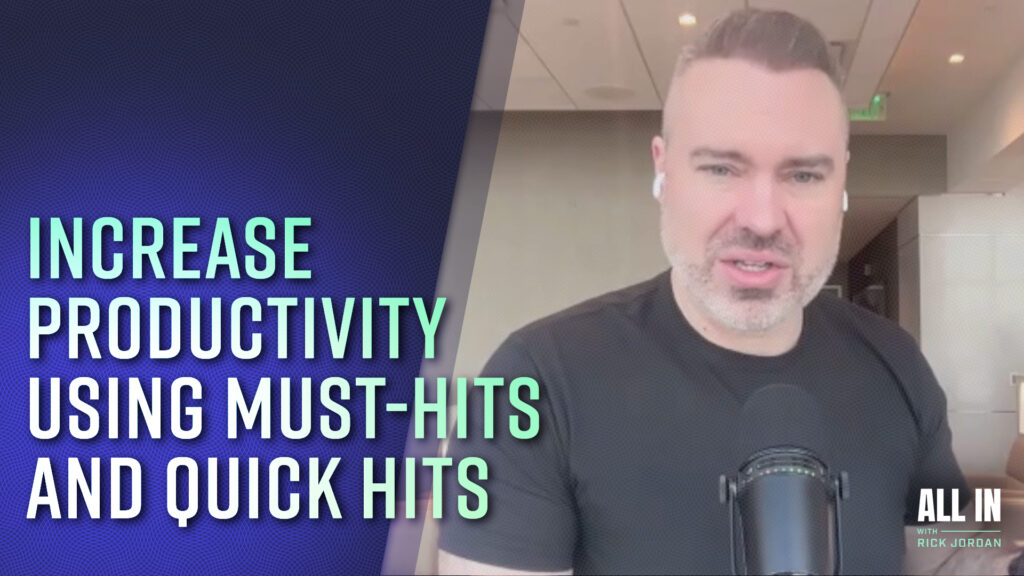 Hey what’s shakin’, hey, I’m Rick Jordan. And today, we’re going all in. There are a couple of things. It’s about time management today and some things that have worked for me, but also things that I want to see you do. And it’s organizing your time, it’s organizing your day in a specific way that makes sense to keep things moving and not be the, stumbling block, or the roadblock for people to actually hear back from you. You’ve probably heard at some point in the past where, you know, always get the most difficult stuff out of the way. First, the tough parts of your day are out of the way. First, you know, the stuff that’s going to take you the longest, that hardest, right out of the gate, that way, you’re not too tired later, or you can make sure that you have time, I’m going to flip that for you today. Because this is something that I want to see you do. There’s a phrase that I’ve, I’ve taught up before, as far as strategically planning your day. And the first part is called Quick Hits.