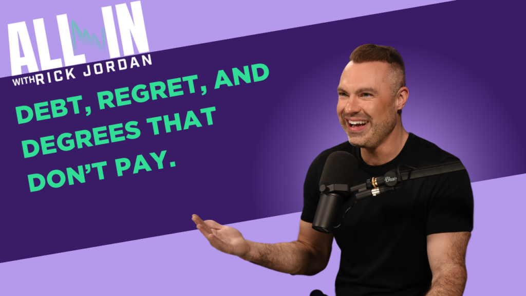 What’s shakin? Hey, I’m Rick Jordan, and today we’re going all in all right, I’ve got something pretty wicked and pretty sick for you. Today, I’ve talked about it before and thrown out a statute about education, right? College, majors, the degrees. And today, this is a topic that you’re going to want to stick around for the whole thing because Is college worth it? Is it worth it? I’ve talked about this stat before. This still remains true about to this percentage point that it’s only around 26 so it’s like one out of every four people after they graduate have their bachelor’s degree, are actually still in the field, or even start working in the field that they got their degree in. It’s stupid, right? Because they go through all these years and incur all this debt, and then they get to the point where three, 470, 5% of people don’t even work in the field that their degrees in and it’s like I racked up all this debt. What am I doing 10 years from now? 20 years from now, it’s like, Why did I even go through that? You know? And I’ve heard all these other things, like, well, college teaches you all these other soft skills, like building presentations and all that. It’s like my kids went through that when they were in sixth grade, in school, okay? It’s a different world. Now. That’s what I used to hear; you know how to write papers and all this other stuff.