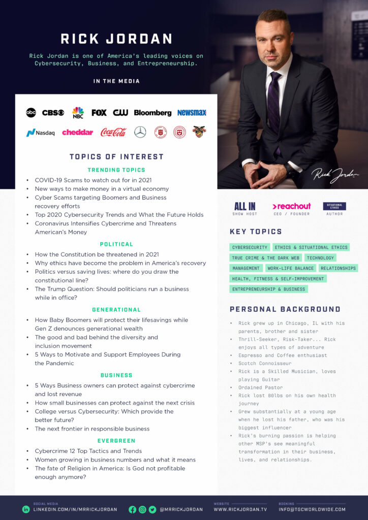 As a nationally recognized voice on Cyber Security and Business, Rick is an award-winning public speaker who customizes appearances for each unique audience to make a lasting impact. Your audience will leave challenged with a new perspective and feel inspired to pursue their professional dreams and personal passions.