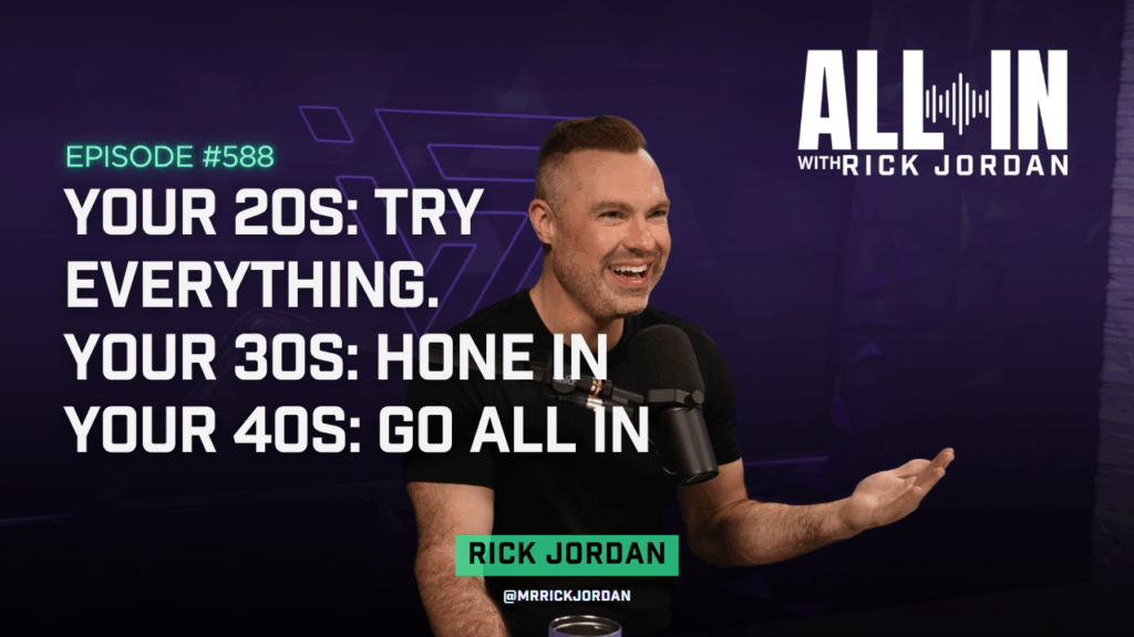 Just try everything that interests you, because there’s so much time to recover from huge mistakes after that. And I actually kind of hope that you make some big mistakes, or that you learn from others’ big mistakes, so you don’t have to make those same ones. There’s nothing like making a mistake and being able to recover through it, I’m telling you, and you have to have time to be able to do that. I’ve made my own huge ones over the past 20 years. And then after your 20s, when you get into your 30s, your 30s are a time to kind of like, hone in on a couple of those so you can start to filter out the things that you’ve tried that you’re like, “Well, that sucked,” or “I suck at it,” or “This isn’t something that really interests me anymore,” and you can start to kind of hone in on these things and start to build a foundation for yourself. And then when you get to your 40s, your 40s are really a time, and I’ll never forget this because a client told me—my very first client who owns six Buffalo Wild Wings, the very first client to reach out—told me that, Rick, when you get to your 40s, that’s the decade that is your busiest.
